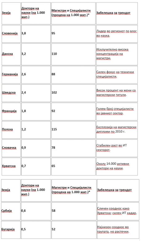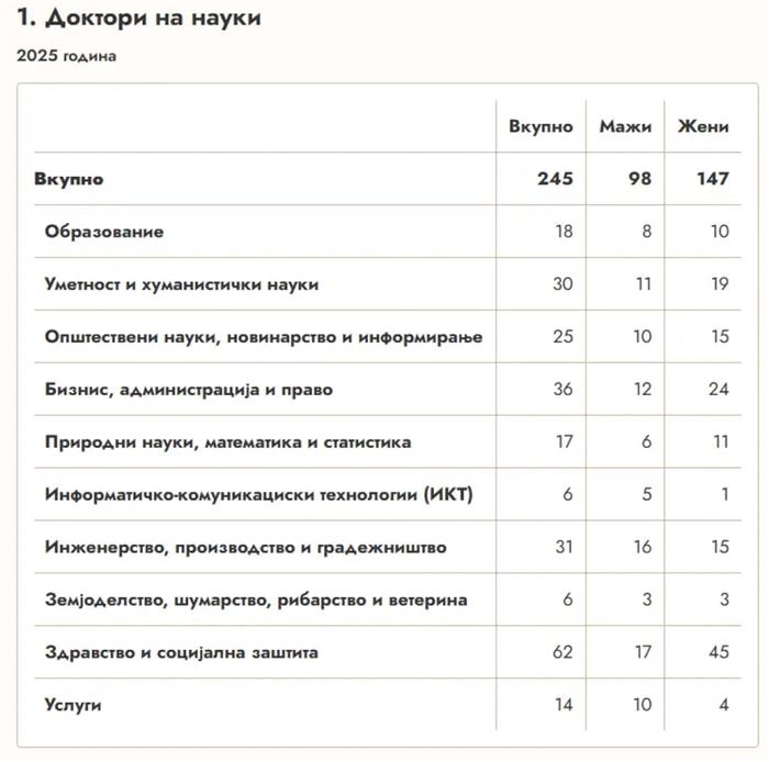 ЖивотЖените во Македонија повеќе магистрираат и докторираат од мажитеСе повеќе магистри, специјалисти и доктори на науки добива државата од година во година, а најголем дел од нив се жени. Последните податоци од Државниот завод за статистика, објавени денеска, велат дека лани магистрирале или специјализирале 1.855 граѓани, што е за половина процент повеќе од 2024 година (1.846 лица стекнале звање магистар или специјалист). Зголемувањето е уште поизразено кај докторите на науки: лани докторирале 245 граѓани, што е дури 14 отсто повеќе од претходната година (во 2024 – докторирале 215 лица). Ова е тенденција која се забележува и во изминатиот период. Во 2024 година, пак, докторирале речиси четвртина повеќе лица отколку во 2023, а сличен раст има и во претходните години. Што се магистрира и докторира? Според податоците, во 2025 година Македонците најмногу сакале да магистрираат или специјализираат во делот на бизнисот и правото. Од 1.558 магистерски трудови, речиси една третина биле во оваа област – 497. Имало и голем интерес за инженерство, производство и градежништво – 256 магистерски трудови, а за општествените науки – 230. И покрај постојаниот недостаток на здравствен кадар, особено специјалисти или пак повисоки научни звања кои ќе го пренесат знаењето на лекарите, од дипломираните доктори само 82 специјализирале или магистрирале. Сосема обратно, дури една четврт од докторските трудови (245) биле во делот на здравството и социјалната заштита – дури 62, што е најголем дел од докторатите лани. „Најголем број од лицата, 25,3%, докторирале во областите здравство и социјална заштита; во бизнис, администрација и право – 14,7%; во инженерство, производство и градежништво – 12,7%; во уметност и хуманистички науки – 12,2%; следат областите општествени науки, новинарство и информирање со 10,2%, а останатите области се со помал процент на застапеност“, пишува во извештајот на Државниот завод за статистика. Жените повеќе учат! Податоците покажуваат интересни тенденции за тоа кој повеќе оди напред во образованието – мажите или жените. Редовно, над 60% од магистерските трудови на годишно ниво се на жени. „Учеството на жените магистри во вкупниот број лица што стекнале научен степен магистер на науки во 2025 година е 61,2%. ... Учеството на жените магистри во вкупниот број лица што стекнале научен степен магистер на науки во 2024 година е 61,6%“, пишува во извештаите на ДЗС за 2025 и 2024 година. Така, лани од 1.558 магистри, дури 954 биле жени, а 604 мажи. Кај специјализациите е уште поизразено – 203 биле жени, а 94 мажи. Бројките од статистиката покажуваат и ваква тенденција – жените, очигледно, се подобри математичарки од мажите. Од 74 магистри во делот на природните науки, математиката и статистиката, дури 60 биле жени, наспроти само 14 мажи. Слично е и во здравството, каде магистрирале 60 жени и 14 мажи. Повеќе магистрирани жени има и во делот на бизнисот, правото и општествените науки, но таму разликите се минимални. „Во текот на 2025 година, 147 жени одбраниле докторска дисертација, што претставува 60% од вкупниот број лица што докторирале во истата година“, констатираат од ДЗС. Во делот на здравството докторирале 45 жени и 17 мажи, а двојно повеќе докторирани жени има во бизнисот и правото (24 жени наспроти 12 мажи), како и кај природните науки и математиката (11 жени наспроти 6 мажи). Каде сме во споредба со другите? Ако се